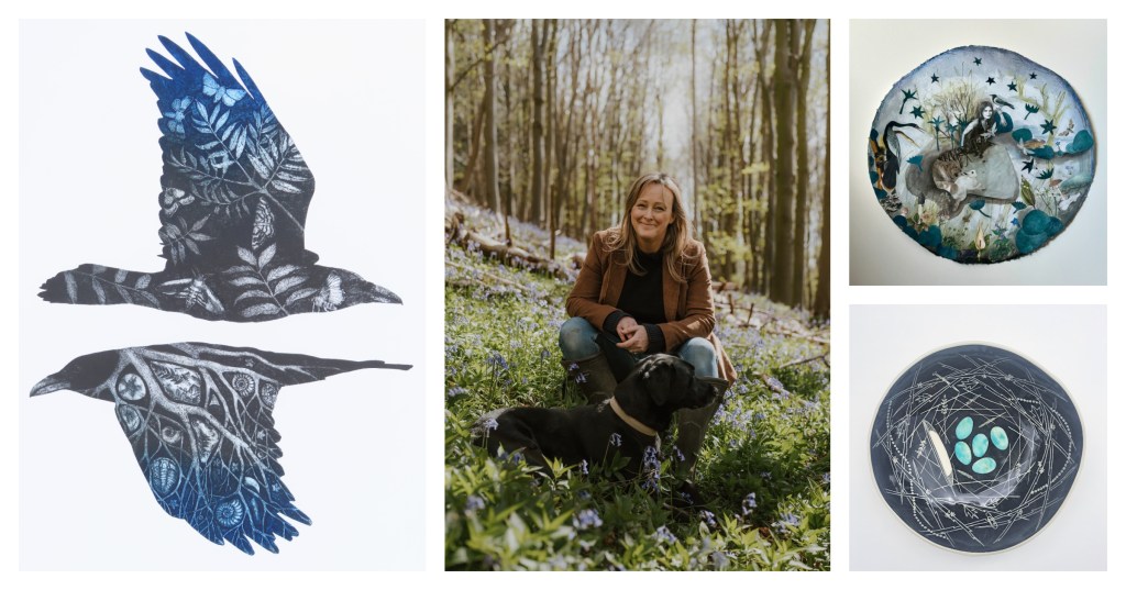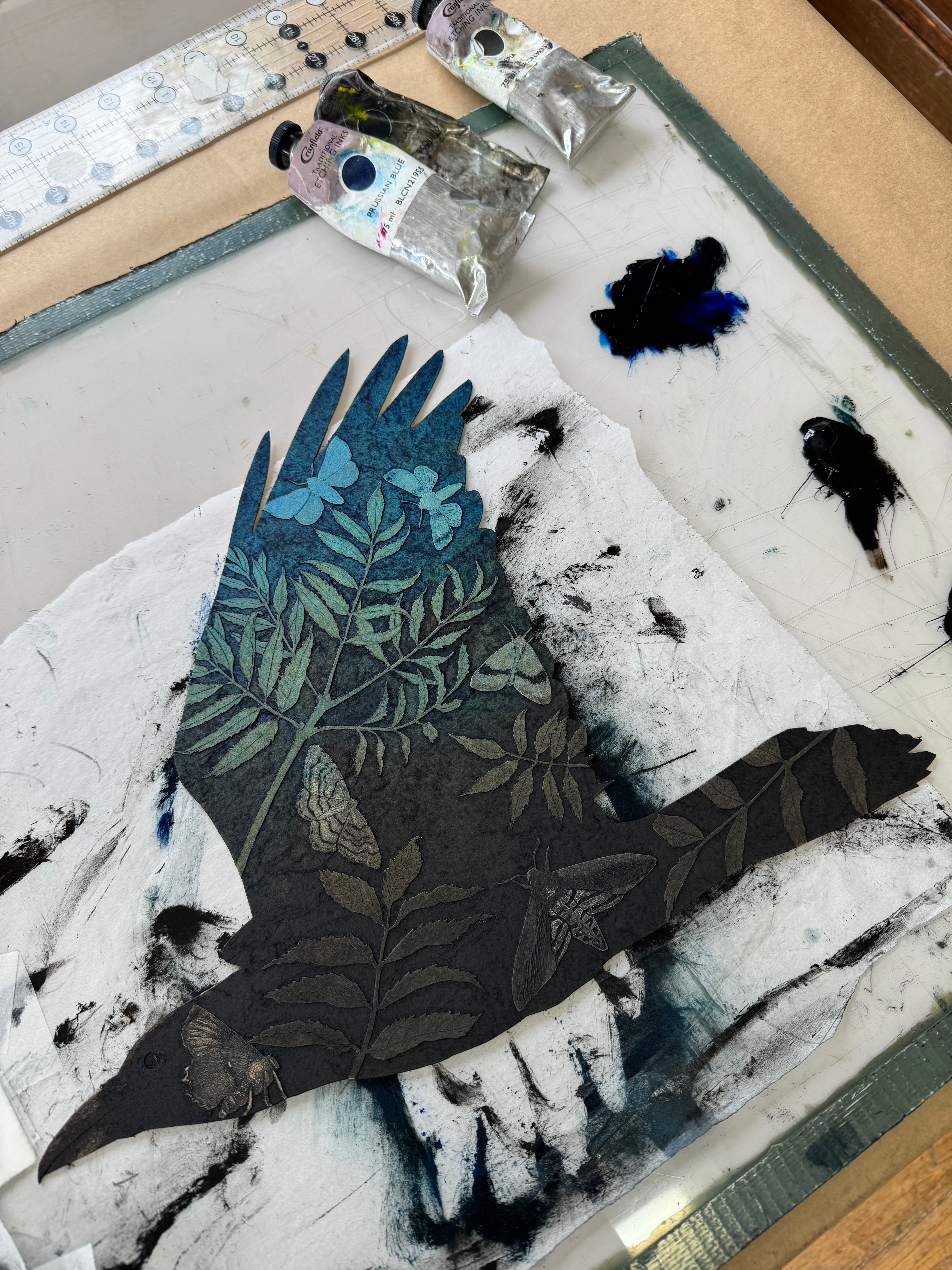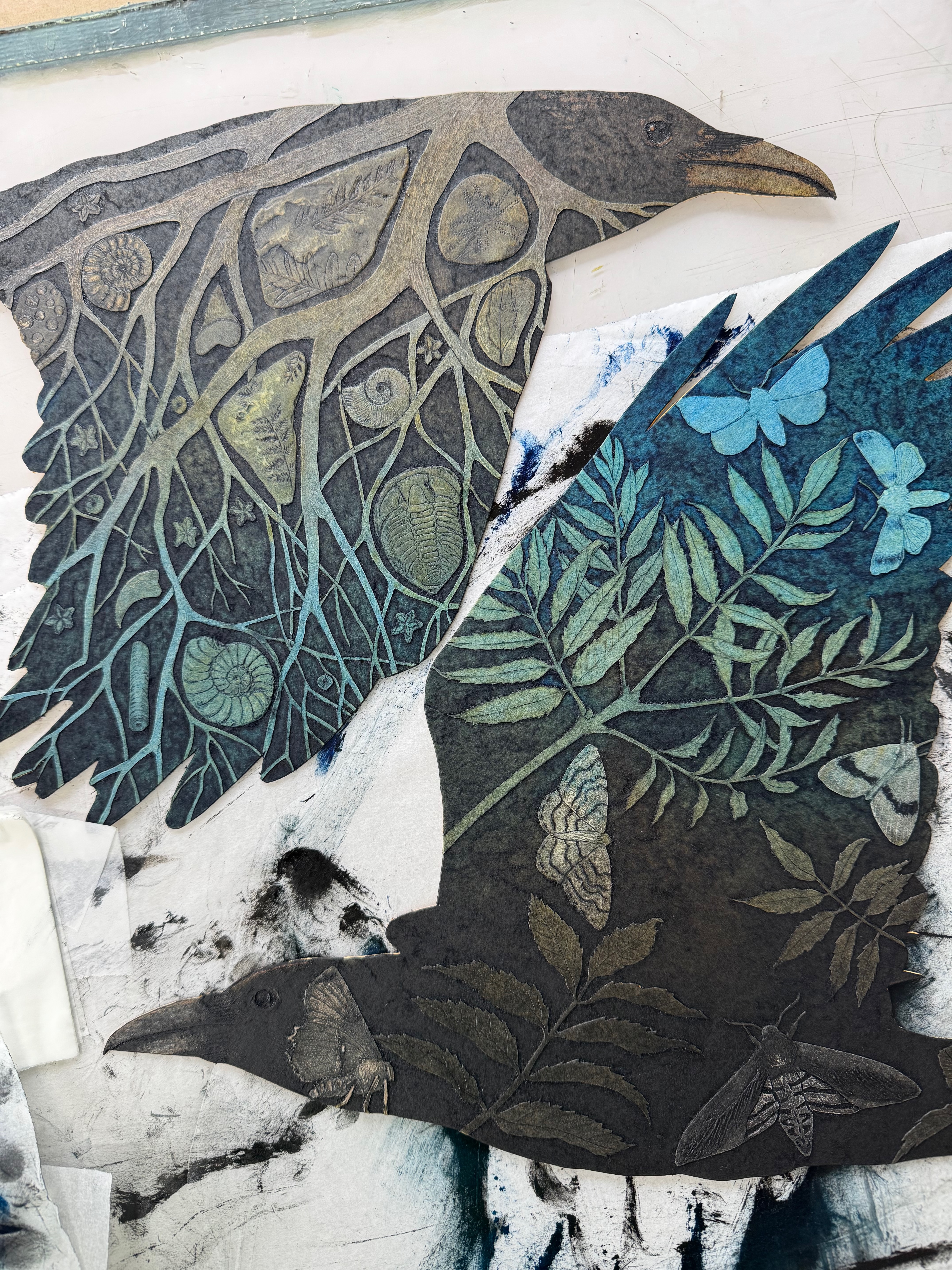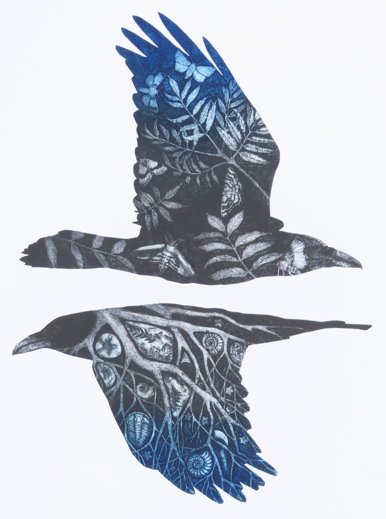 My collagraph feathers are inspired by the many places throughout Yorkshire that are named after ravens and also the Norse myth of Odin and his two ravens, Huginn & Muninn (Charlotte’s feathers are ceramic and Josie’s are paper collages).