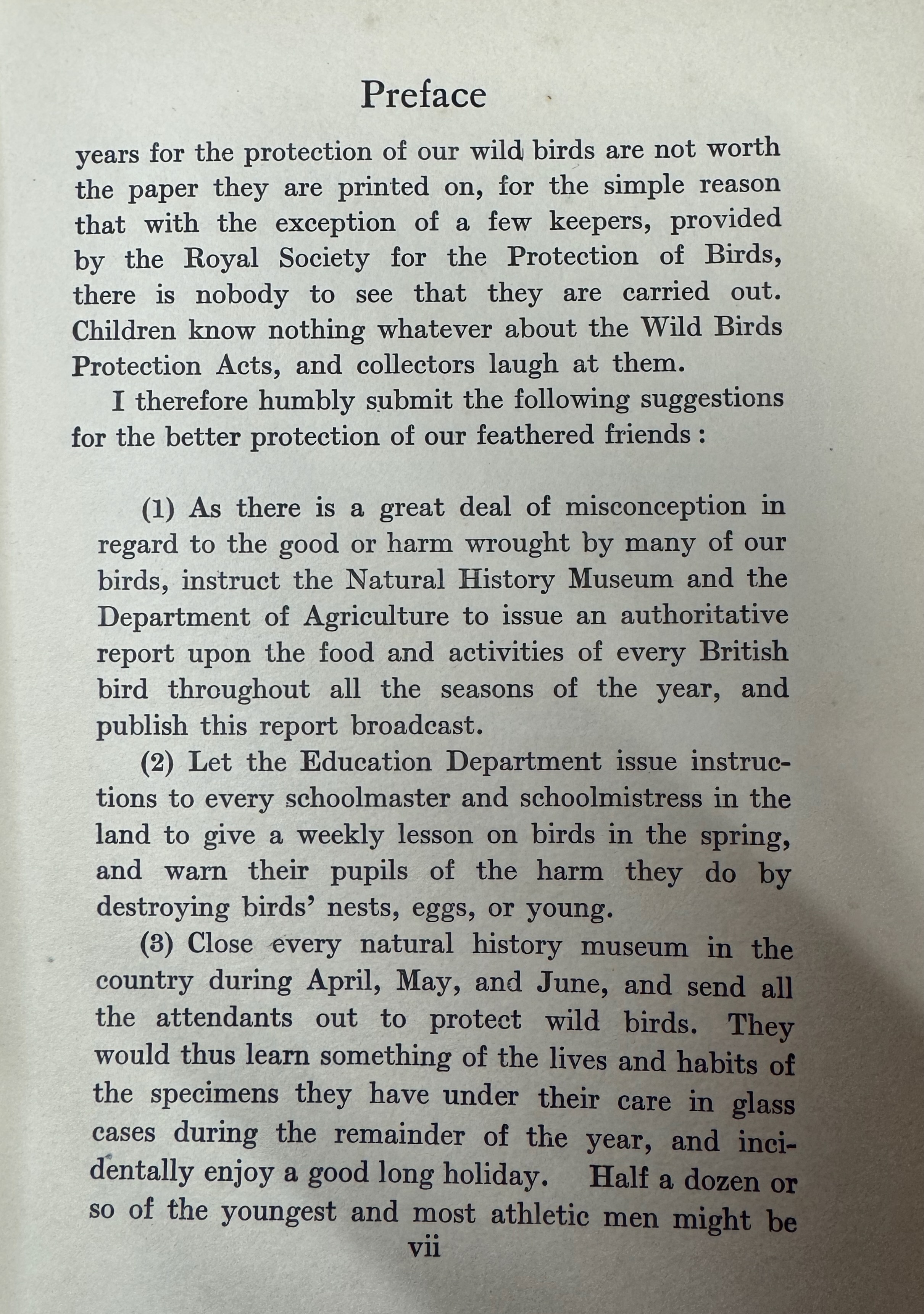 Kearton goes on to say “I have been an observer of bird life all my days, but never remember a time when members of the avian world were so purposefully persecuted as the present. It is no exaggeration to say that not quite ninety per cent of the nests, great and small, built in places accessible to public are wantonly destroyed”. He outlines his proposals to help protect birds in the preface of the book (see photos above).