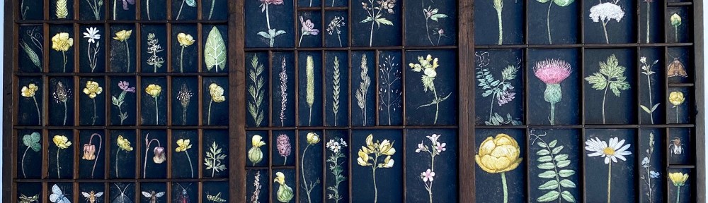 IMG_5825My meadow collection has been a long time in the making. I began the work last year when the hay meadows were in full flower. I spent time sketching the different grasses and flowers in preparation for making the plates. It became obvious that the piece would be something of a labour of love and I was tied up with other work last year so I put it to one side until January when I knew I’d have six months to work almost exclusively on the final work for the exhibition. The finished piece is created within an old print type drawer of the kind that you often see in junk and second hand shops. I’ve used smaller ones before in my Collections project and I like the way they give the pieces a museum quality with each print becoming an artefact within each space. I also thought that each individual print shown in a section of the tray would give the whole piece a feeling of a cross section of a meadow and there was a connection with Marie Hartley and her wood engraving blocks and the original books being created using letterpress.