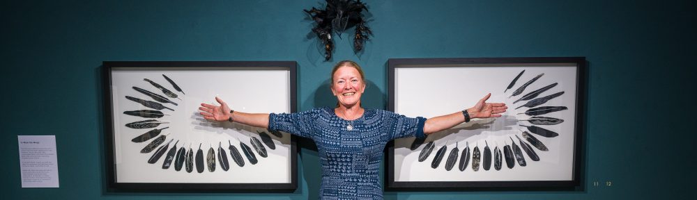 For Charms and Murmurings at Ryedale Folk Museum – my latest Collections exhibition with Josie Beszant & Charlotte Morrison – we are showing work inspired by the folklore, mythology and stories surrounding birds. Ravens feature in many of our pieces including our collaborative work ‘Corvid’. I made a template showing the primary and secondary wing feathers of a raven and we each made fourteen feathers that, when collected together, formed a pair of ‘wings’. I love the distinctive primaries on a raven’s wing that look like fingers stroking the sky.