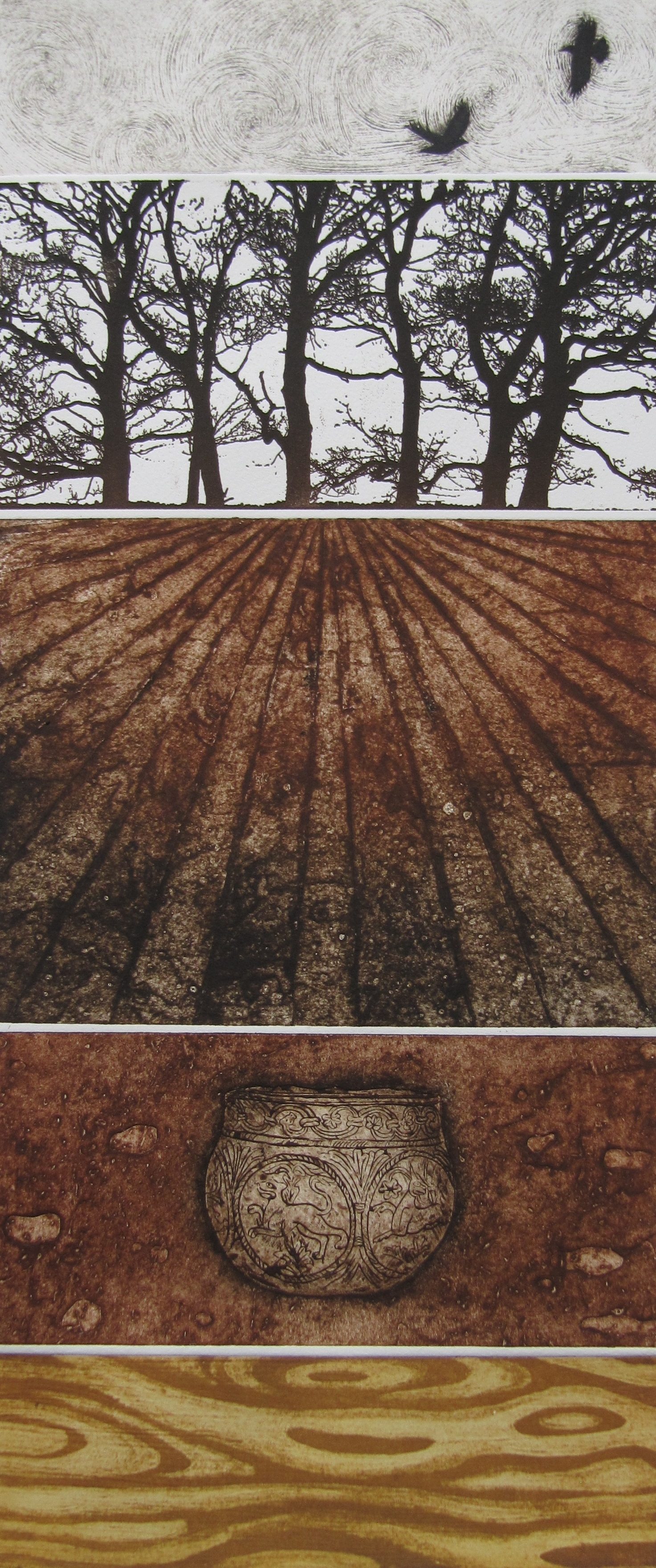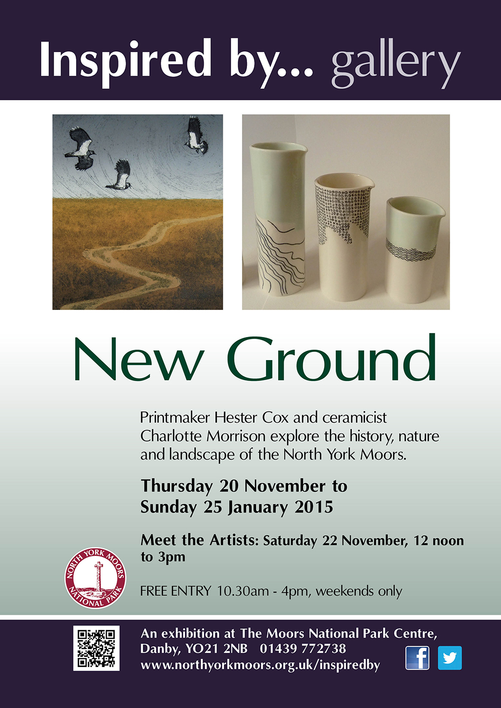 cdc752b7-98d3-4db6-b187-addd70c4bfc6My exhibition with ceramicist Charlotte Morrison is now up and running at Inspired By…Gallery in Danby. It is open daily 10.30am – 4.00pm until Christmas Eve and then it reopens for the 1st-4th January before becoming weekends only throughout January. The prints on show are a mix of collagraphs, intaglio photopolymer prints and a set of monotypes combined with drypoint. I had lots of ideas for images to create but, as usual, time restrictions and other commitments meant that I had to go with the ones that just couldn’t be shaken whilst postponing some of the others for another time. It would mean writing an essay for me to describe all of the images on show and to explain their origins but there are a few key pieces that I’ll mention here. Charlotte has created some beautiful collections of vases, cups and jugs based on old pathways, drovers roads etc. in the North York Moors national Park. Visit her website to see more of her work.