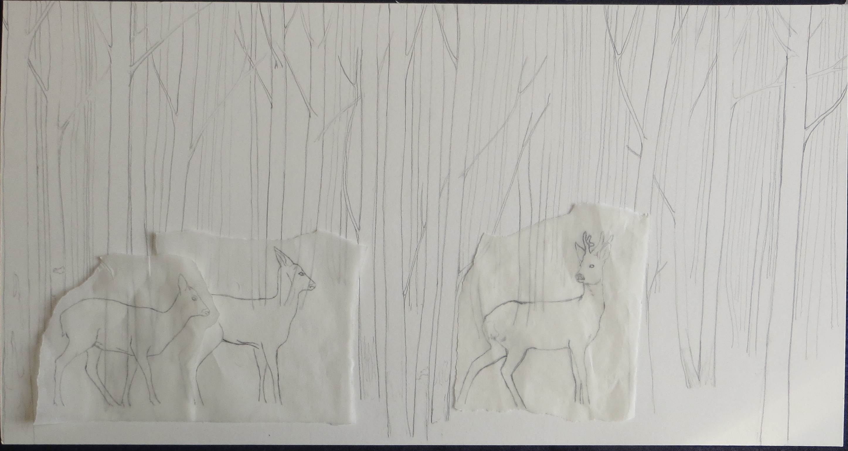 The first pieces to be made were based on a very foggy run that I went on with my partner and our dog. We parked at Sutton Under Whitestonecliff and ran to Gormire, up through Garbutt wood and onto Sutton Bank, along past the Glider club and down via the white horse, through the plantation to Hood Hill and back via Sutton bank and Gormire. Doing a large figure of 8. The ethereal woods and soft focus views triggered off a series of photopolymer prints developed when I was over at Algarden Printmaking Studio in Sweden. For more details, see my previous blog posts Seeing the Wood for the Trees & Photopolymer Experiments Continued….This is a small triptych that evolved:triptychI also spent months designing and cutting a collagraph plate inspired by the birch copse at the base of White Horse bank and of roe deer that I saw in the area. The birch forest was not too much of a problem as I had had previous success with creating a collagraph plate of one last year but I wanted a small group of deer and the grouping, positions and sizes (not to mention direction) took a lot of fiddling about in order to get it just right. The way that I work is that I’ll sketch out the forest and then I’ll sketch various deer in different positions and then trace them off onto pieces of paper that I can move around on the forest drawing. I’ll photograph all of the combinations so that I can compare them on my laptop and then I use photoshop to flip them to see what the plate will look like when printed (collagraphs print in reverse).