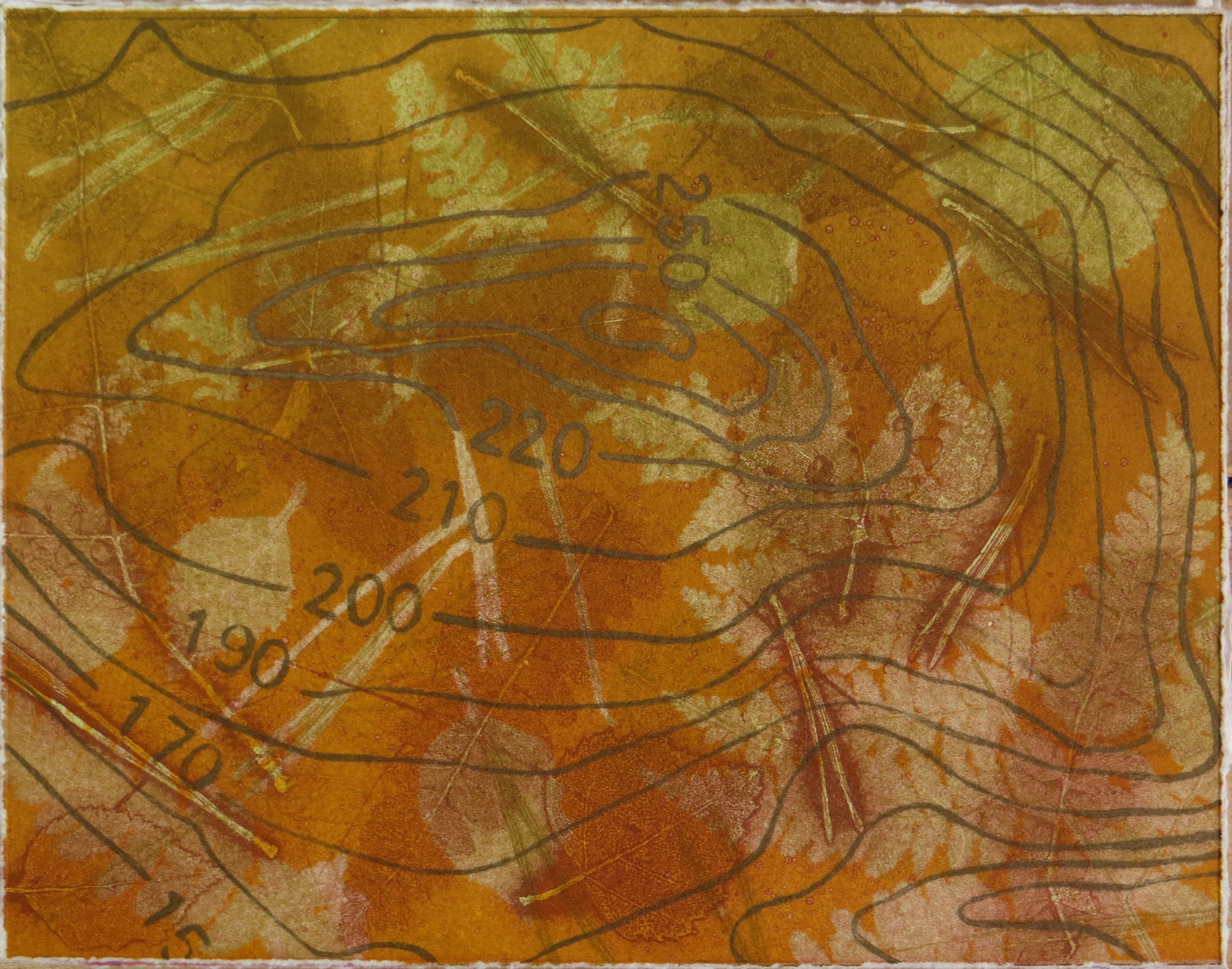 Passing ThroughOne of the key things about the project was that I was revisiting some of my favourite running routes and I wanted to allude to that in the imagery. Three places that I went to numerous times had quite different flora and topography and I decided that I could use this to make a series of prints. I set aside extra time on one of my visits with Paul Harris (who filmed me throughout the year) so that I could collect plant material from three of the sites. When I got back to the studio, I carefully pressed the different leaves and flowers in the pages of a phone directory and left them for a few weeks to dry. In the meantime, I studied an OS map of the areas and drew out the contours for the hills from where I’d collected the plants. Scratching into pieces of plastic, I created drypoints of the contours.